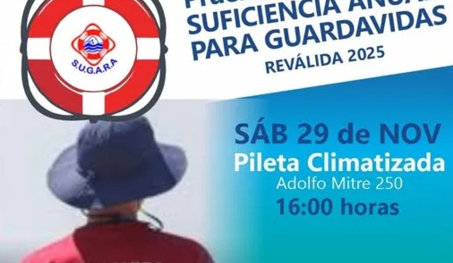 La Prueba de Suficiencia Anual para Guardavidas – Reválida 2025 se llevará a cabo el sábado 29 de noviembre, a las 16:00, en la Pileta Climatizada municipal, ubicada en Adolfo Mitre 250.
