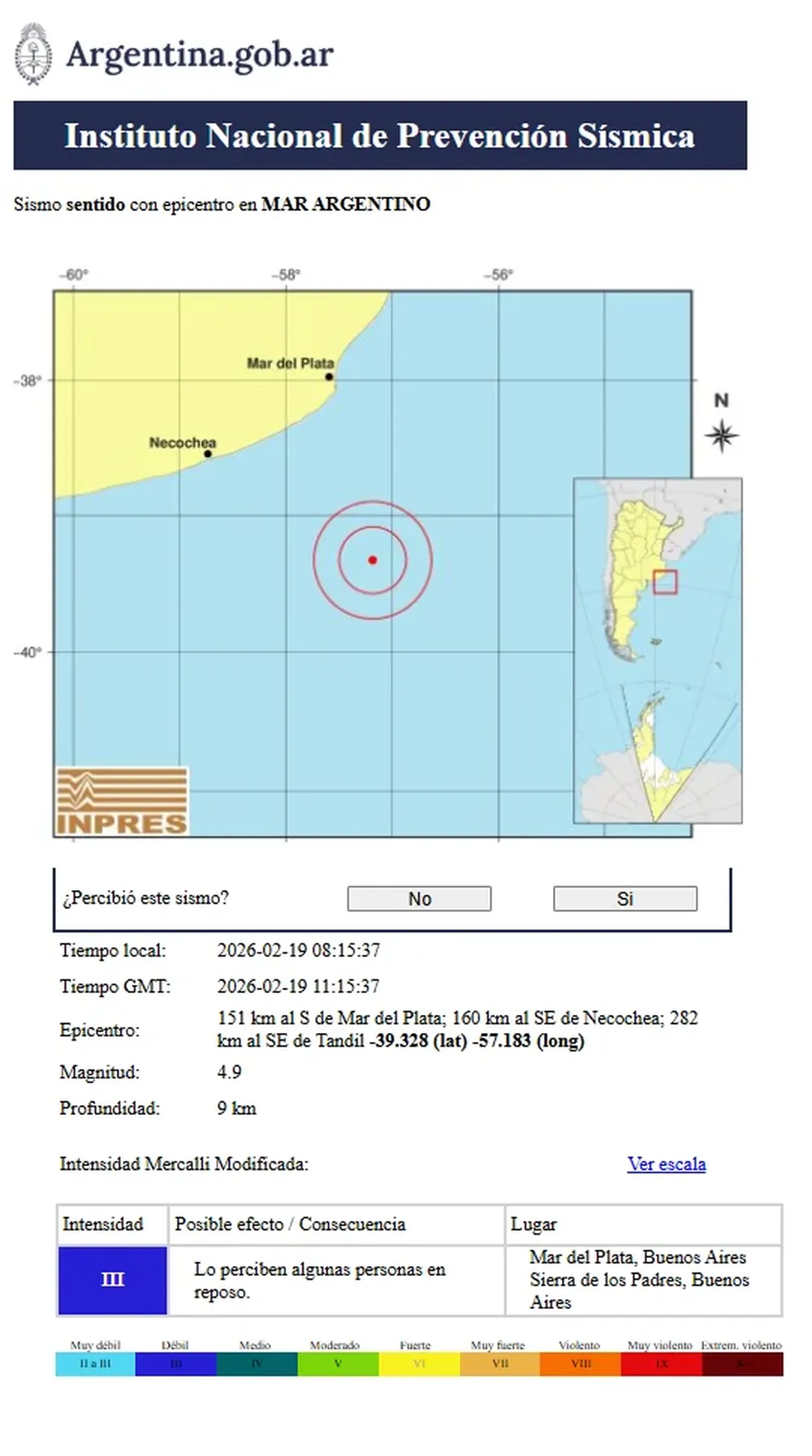 El Instituto Nacional de Prevención Sísmica (INPRES) informó que el sismo tuvo una magnitud de 4,9 y lo clasificó como de intensidad “débil”. Según el reporte, el epicentro se ubicó a unos 151 kilómetros al sur de Mar del Plata y 160 kilómetros al sudeste de Necochea, en el Atlántico Sur.